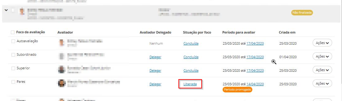 A situação do avaliado apresentada considera todas as avaliações do ciclo, sendo assim, o avaliado contém avaliações não finalizadas com outros avaliadores.