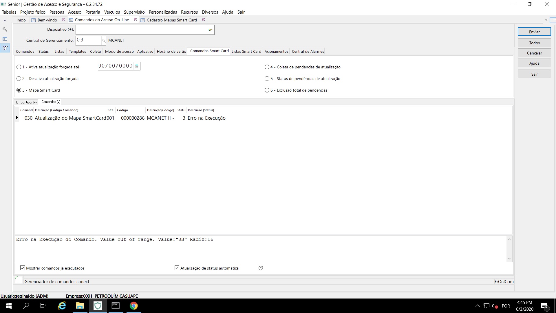 Ao enviar o Mapa SmartCard ocorre erro abaixo: