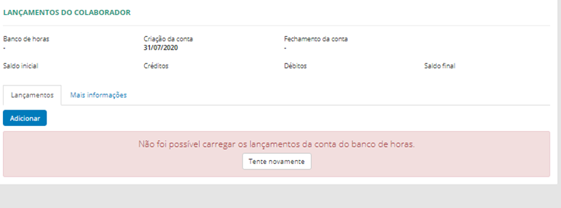 Problema: Descrição do Problema: Ao consultar a tela de manutenção do banco de horas apresentava a mensagem que não foi possível carregar os lançamentos da conta do banco de horas. Tente Novamente.