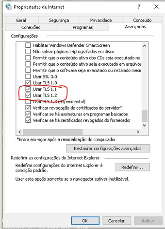 Solução: Inicialmente verificar se todos os pré-requisitos de implantação foram atendidos e caso continue ocorrendo o erro, abrir o navegador Internet Explorer na máquina onde está sendo realizada a instalação e observar se nas configurações do navegador, no menu Ferramentas > Opções da internet > aba 'Avançadas', as opções de TLS estão marcadas conforme print abaixo:
