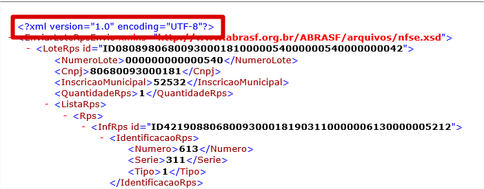 Essa situação ocorre pois a codificação do XML de envio em lote é no padrão internacional UTF-8, Esse padrão não permite utilização de caracteres específicos de acentuação da língua portuguesa ou caracteres especiais.