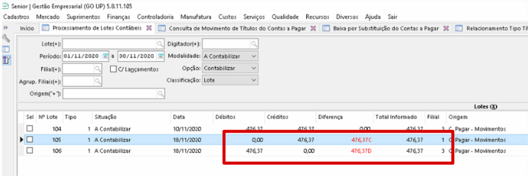 Como consequência, o lote gerado por filial só terá um débito na filial 3 e um crédito na filial 1, somando os dois os saldos fecham.