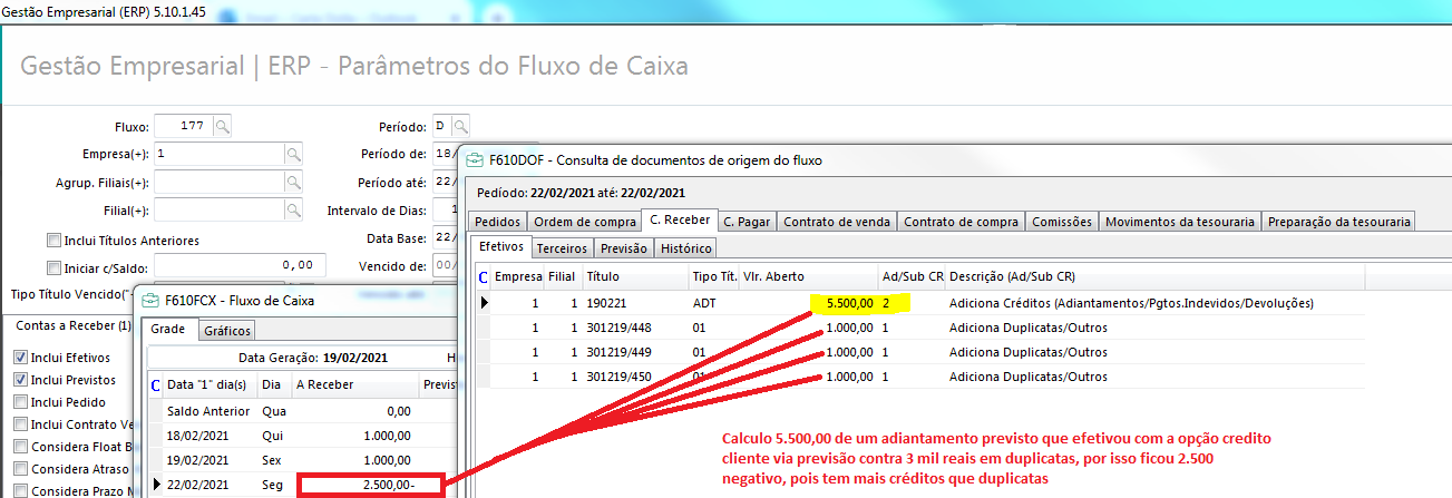 Gostaria de saber porque a coluna A Receber da tela F610FCX do fluxo de caixa fica negativo.