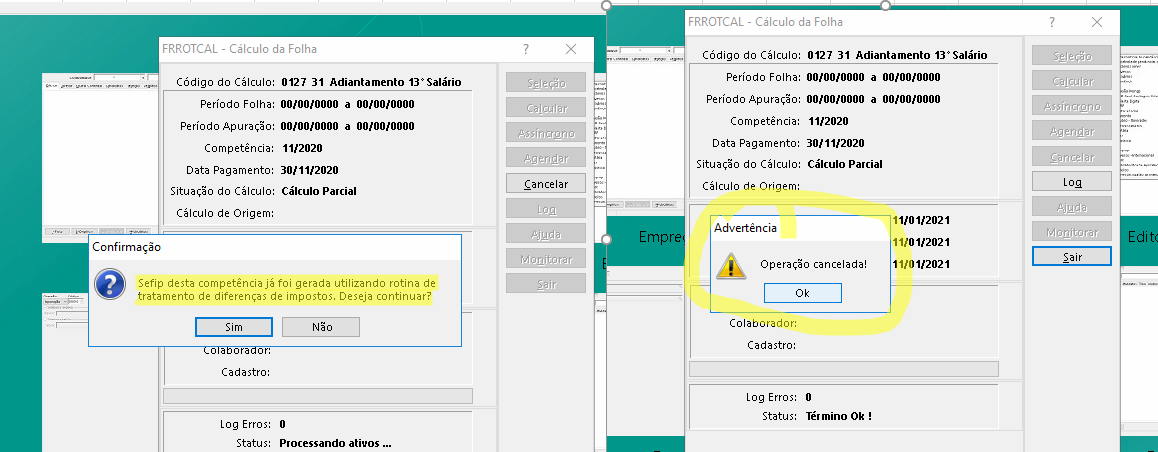 Neste caso como no Log do Console trazia apenas a informação de Operação Cancelada, orientamos realizar o calculo de forma manual, ainda que de apenas um funcionário para verificar o que esta impedindo o calculo.