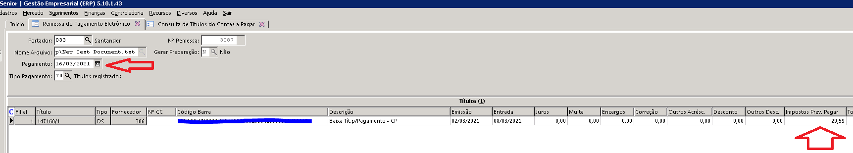 Quando é inserido um título para pagamento eletrônico na tela F510PRM_FPPE - Finanças / Gestão de Contas a Pagar / Pagamento Eletrônico / Remessa, com data de pagamento igual a data de vencimento, é acrescido um valor a mais para impostos, campo 'Impostos Prev. Pagar', conforme imagem abaixo.
