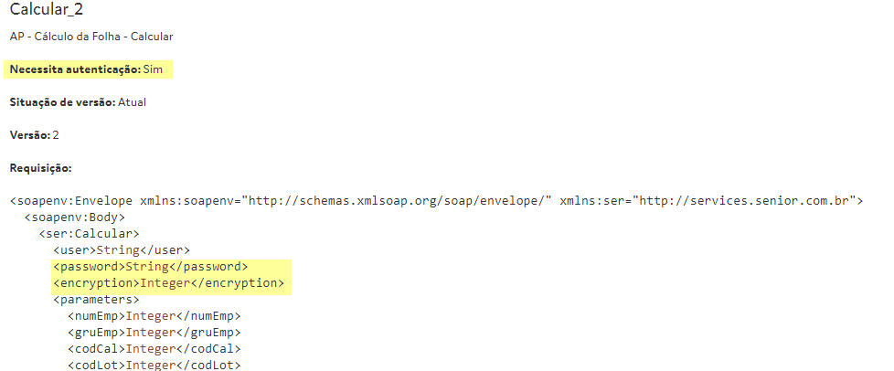 Na regra não foi passado usuário e senha. Conforme Webservice com.senior.g5.rh.fp.calculoFolha é necessário autenticar: