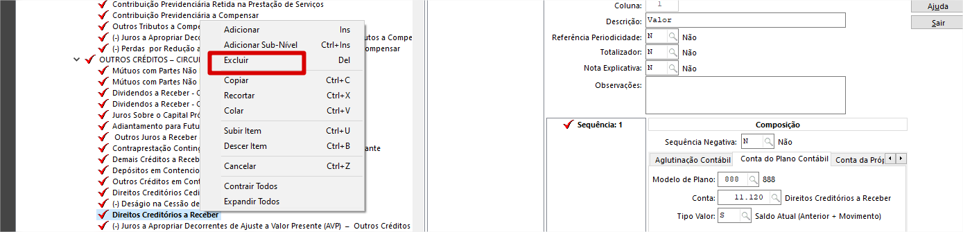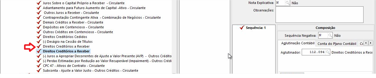 Solução: Solução: Na base do cliente em questão todas as linhas da visão receberam aglutinadores, com exceção da linha 'Direitos Creditórios a Receber'.