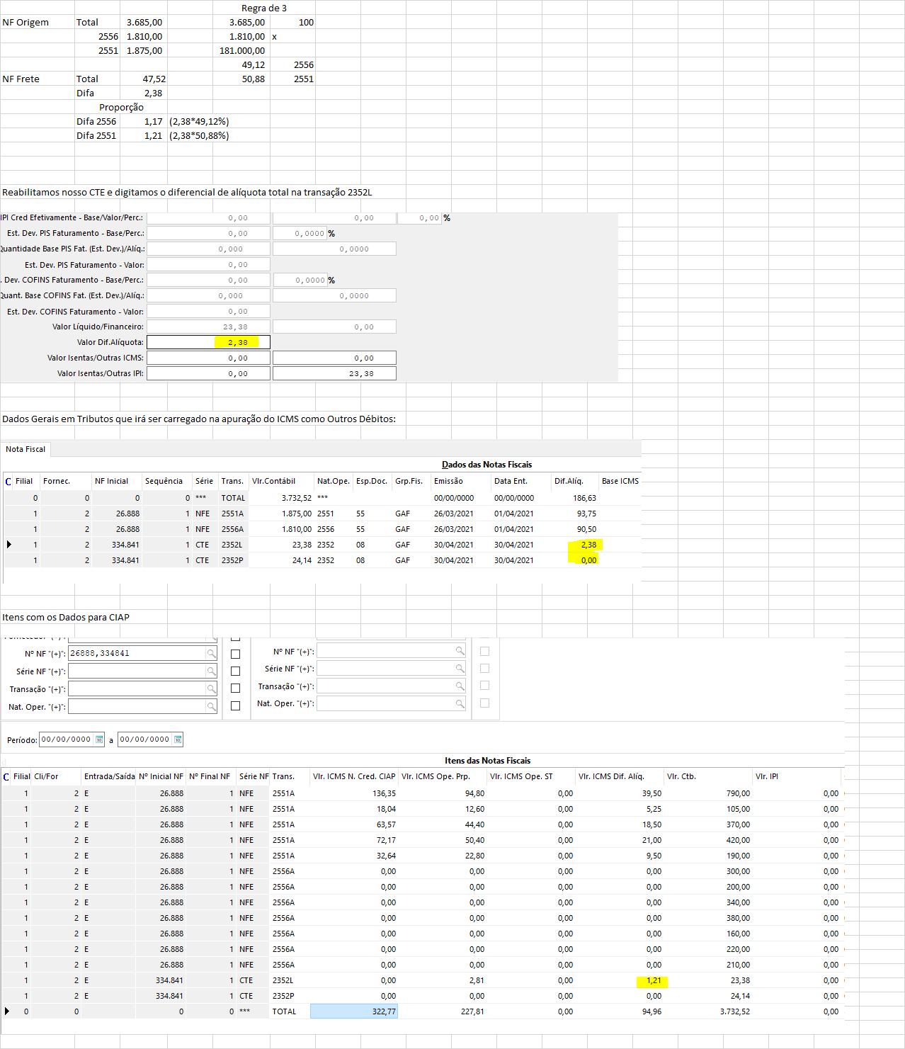 F070FCP o campo "Considera Parâmetros das Origens NF Frete." está parametrizado como 0-Nunca, pois se trocar para 1-Sempre o sistema leva em consideração a NF de origem o ICMS passar para 1,37 no item com CFOP 2352L.