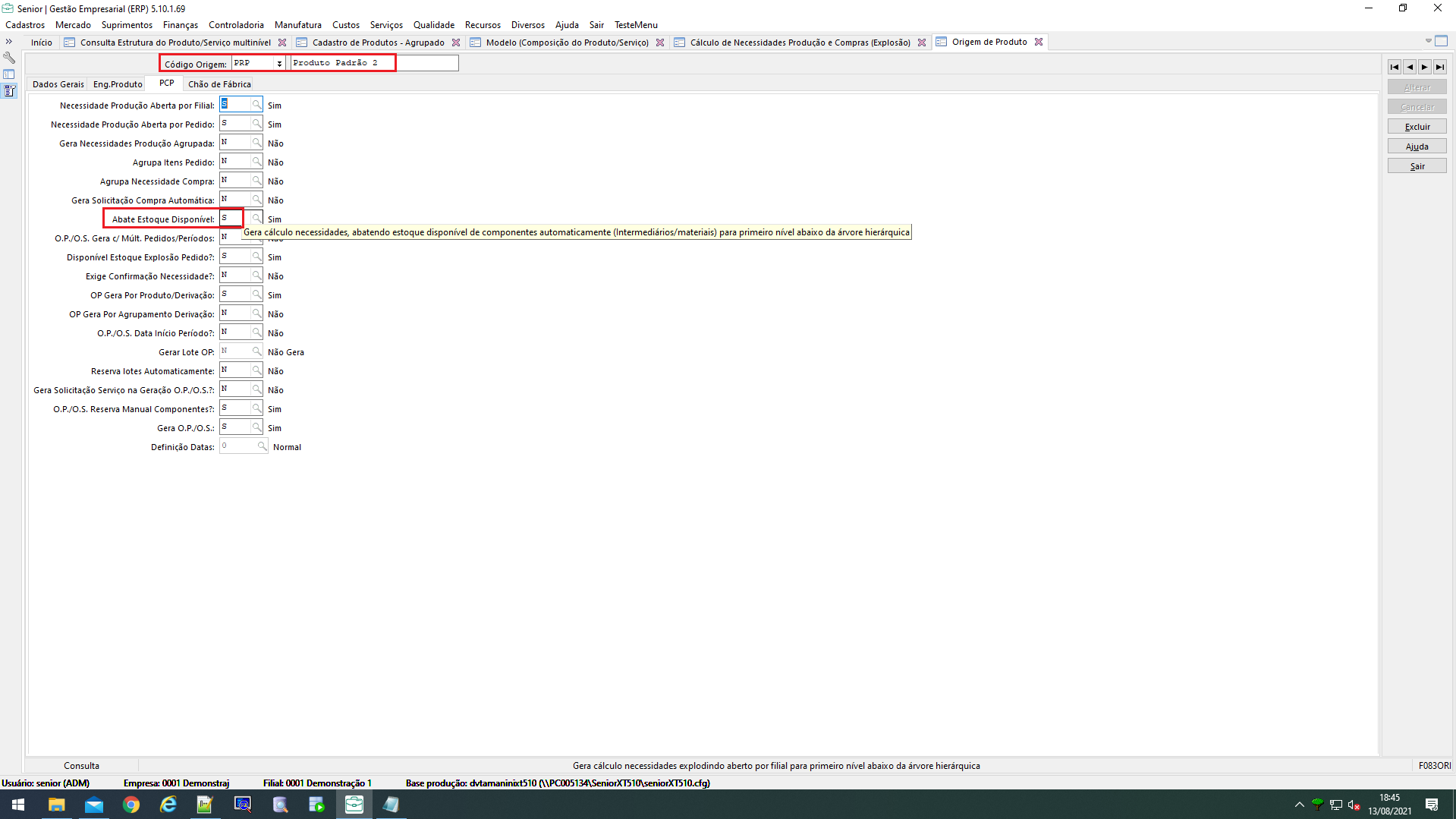 - Parâmetro 'Abate Estoque Disponível' na tela F083ORI - Cadastros / Produtos e Serviços / Origens / Cadastro do Produto Produzido, aba PCP, do Produto Pai PRP2, cujo código da Origem é PRP, está igual a S;