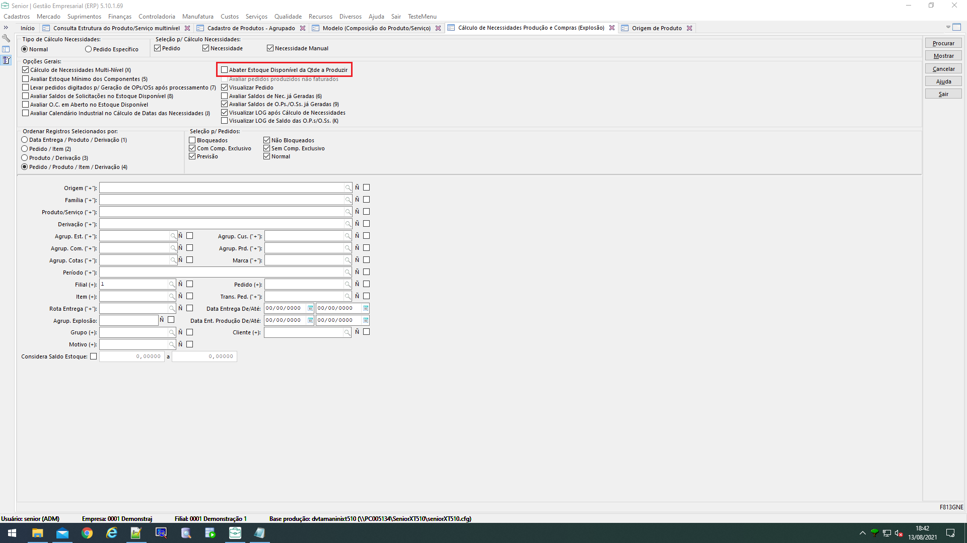 - Sem dar flag no campo 'Abater Estoque Disponível da Qtde a Produzir' na tela F813GNE_MPNE - Manufatura / Gestão de PCP / Necessidades de Produção/Compra (MRP) / Cálculo (MRP);