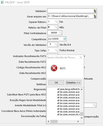 Problema: Ao realizar a geração da sefip ocorre erro 8217: