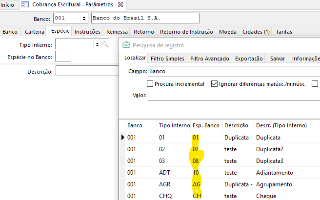 Essa situação pode ocorrer quando foi cadastrado várias espécies do ERP com a mesma espécie do banco.