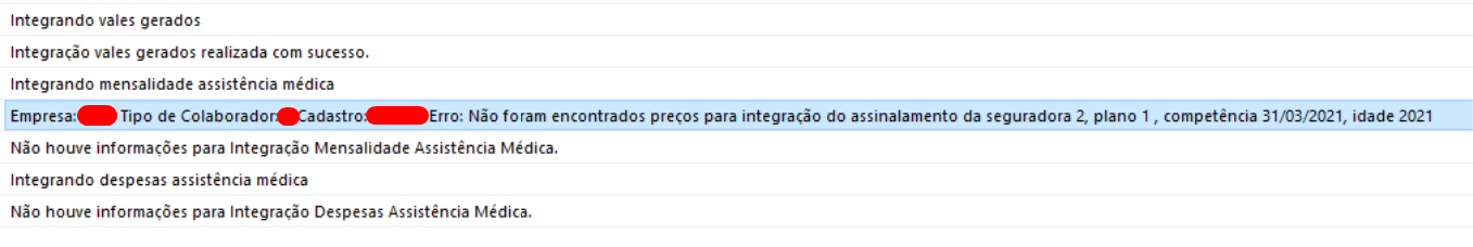 HCM – Assistência médica – Empresa: XX Tipo de colaborador: XX Cadastro: XX Erro: Não foram encontrados preços para integração do assinalamento da seguradora XX, plano XX, competência DD/MM/AAAA, idade AAAA