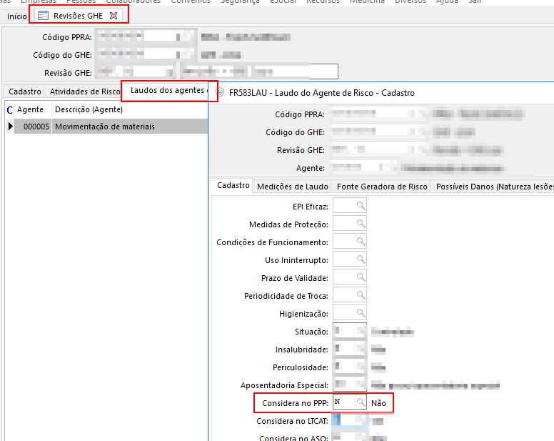 2. Acesse o menu Segurança / Gestão de GHE / Laudo dos agentes de risco aba Cadastro abaixo no campo "Considera PPP":