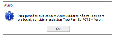 Esta mensagem é apresentada, pois no cadastro da pensão, possui o Tipo Pensão FGTS com Percentual, porém na base, possui os acumuladores 9013, 9014, 9015, 9016 ou 9100 à 9400.