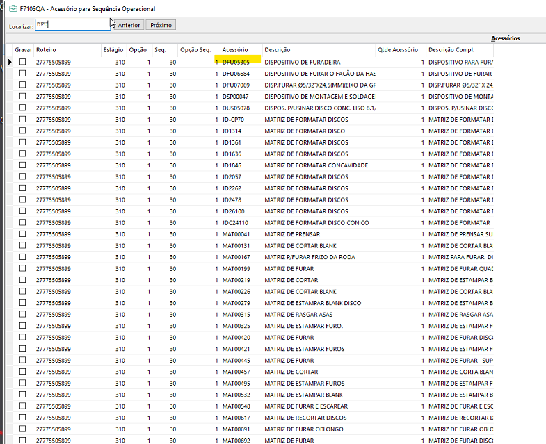 Boa Tarde, nosso setor de Engenharia gostaria de saber o por que não é possivel utilizar o "Localizar" para encontrar itens com mais facilidade, o processo de seleção de um material na tela de acessórios "F710SQA" apenas localiza o que esta no "cabeçalho" da tela, e não os demais itens.