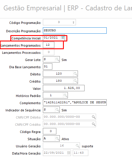 Temos como exemplo o seguro, se a empresa todo ano contrata seguro então podemos realizar a provisão desse seguro, assim poderei fazer somente um lançamento programado que se repetirá por 12 meses, se tornando mais ágil seu processo de contabilização, veja o exemplo abaixo: