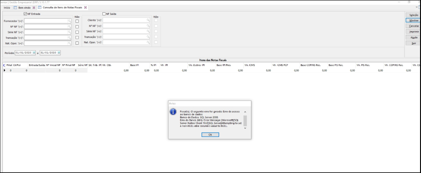 Ao tentar fazer uma consulta informando qualquer período na tela F660CIN e selecionando "NF de entrada", é apresentado erro de acesso ao banco, conforme anexo.