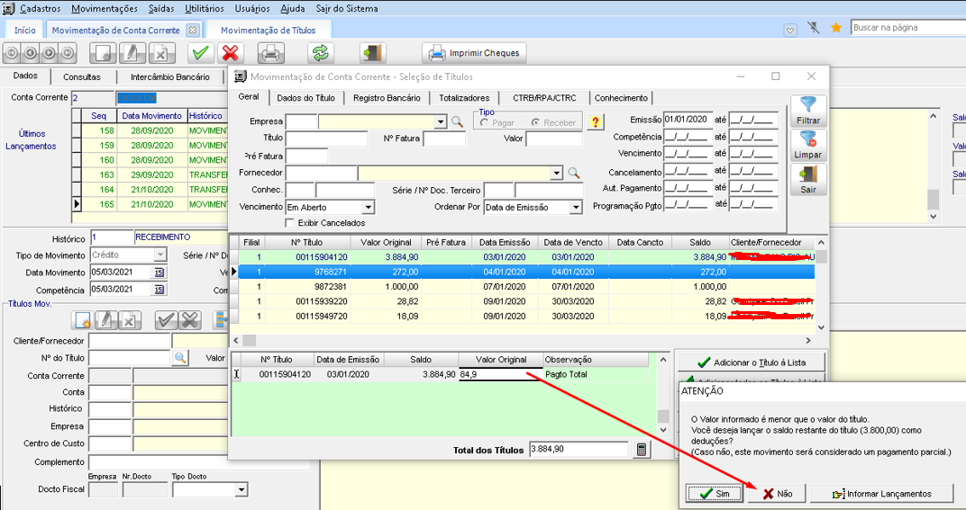 Ao baixar um valor parcial, o status está sendo alterado para "RECEBIDO".