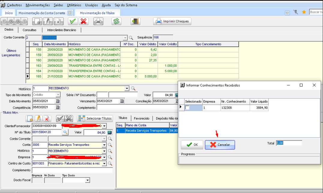 Para que ao baixar o valor PARCIALMENTE e o status não altere para RECEBIDO, ao efetuar o procedimento de baixa, na tela apresentada " Informar Conhecimentos Recebidos" deverá ser selecionado a opção "CANCELAR" ao invés de "OK", dessa forma o status não ficará como RECEBIDO.