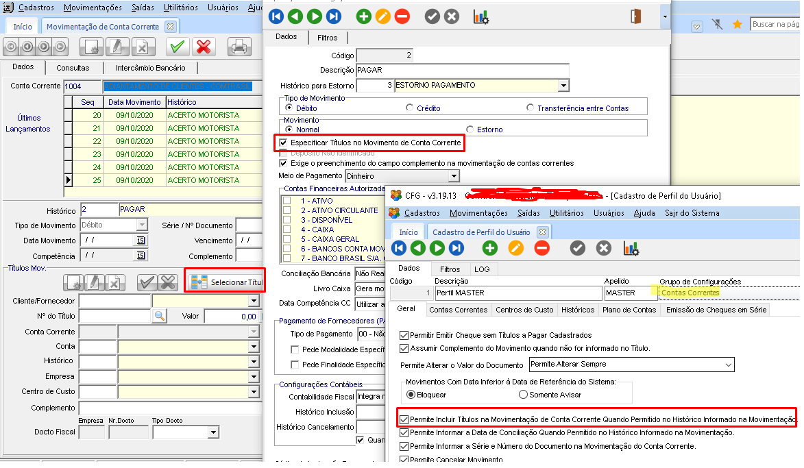 3.1. Marque o checkbox 'Permite Incluir Títulos na Movimentação de Conta Corrente Quando Permitido no Histórico Informado na Movimentação';