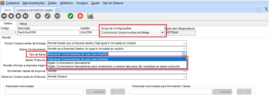 3. Na guia Dados dentro do Grupo de Configurações selecione a opção 'Controle de Comprovante de Entrega';