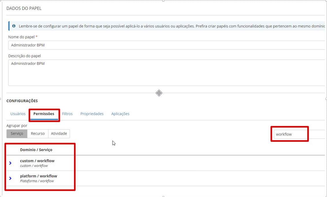 Este é o domínio / serviço responsável por todas as permissões de administração do BPM. Aqui é necessário selecionar todas as opções disponíveis a todos os recursos que são apresentados.