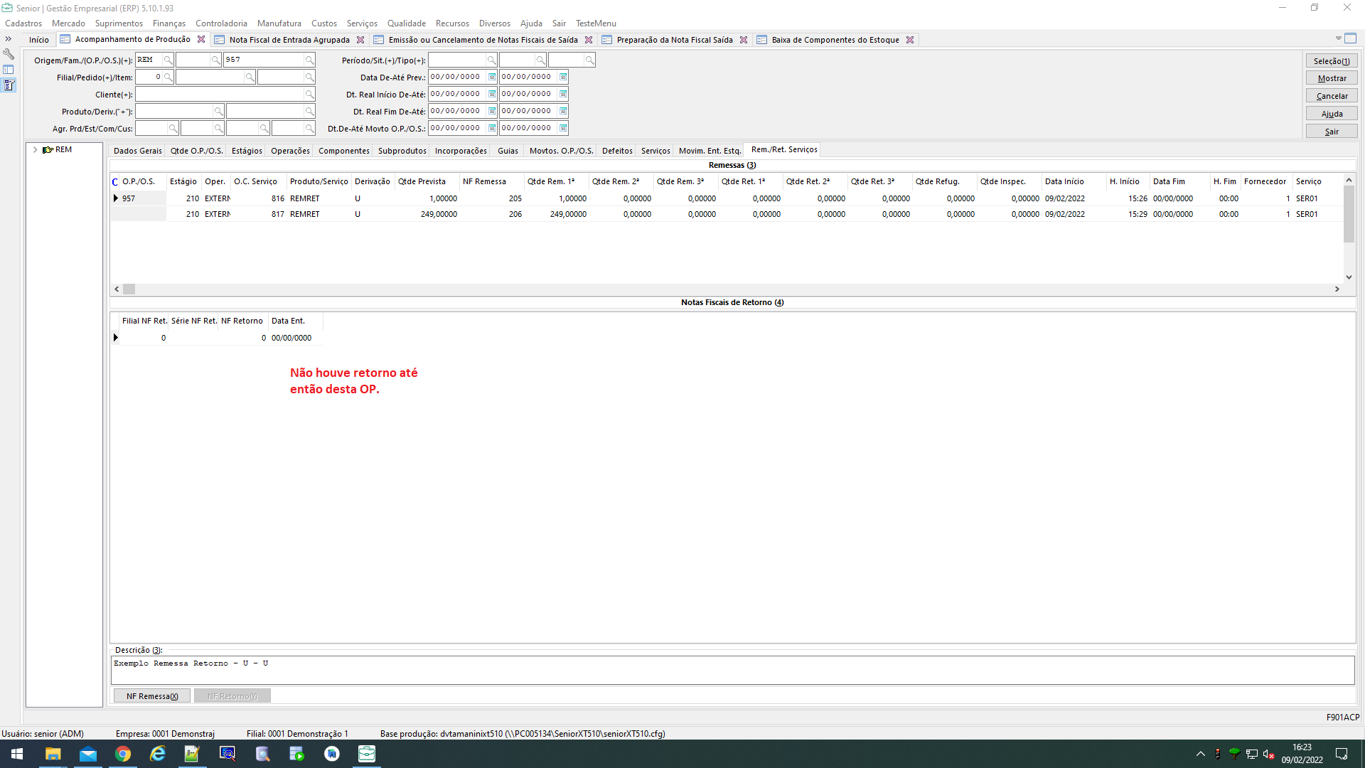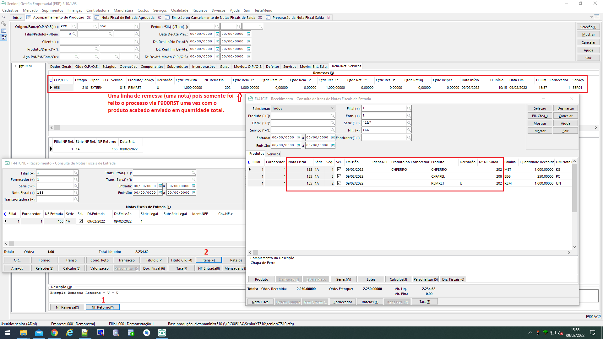 Quanto à rastreabilidade, como dito acima, perde-se a rastreabilidade da remessa através da tela F901ACP aba 'Rem./Ret. Serviços', porém após o retorno é possível validar o retorno (via botão NF Retorno) e verificar os itens deste retorno (via botão Itens) e assim chegar na informação de que os itens da nota vieram de duas ou mais notas de saída, como pode ver no anexo. - É possível também manter o rastreamento total das remessas enviando 0 unidades do produto acabado. Para este cenário será necessário NÃO possuir o ID PCP-910NGOCS01 ativo no ambiente.