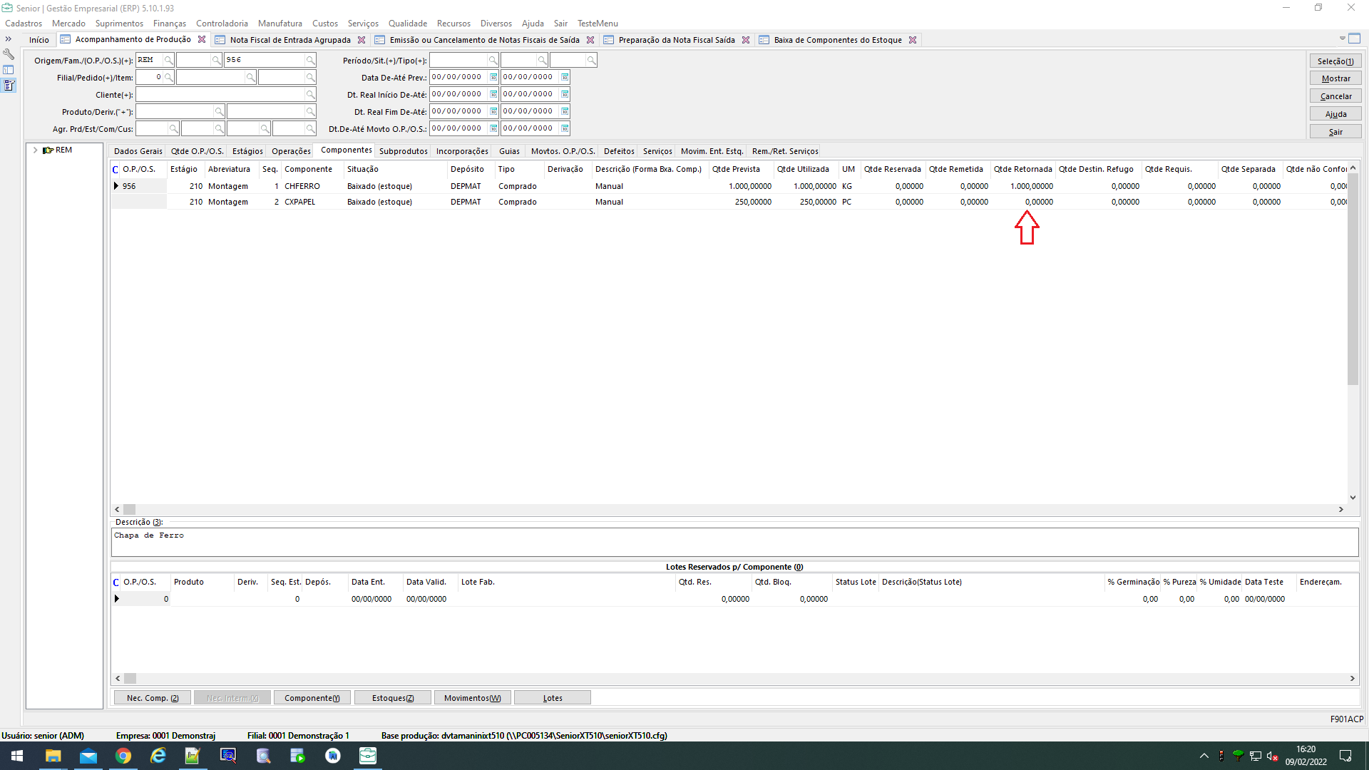 Feito isto, caso não haja integração de transações para efetuar a baixa do componente, é necessário ir à tela F900BAC e efetuar a baixa deste componente manualmente. Neste passo para a OP, o componente não ficará com sua quantidade como remetido, pois ele foi baixado manualmente via tela F900BAC e também porque não foi efetuado via processo da tela F900RST.