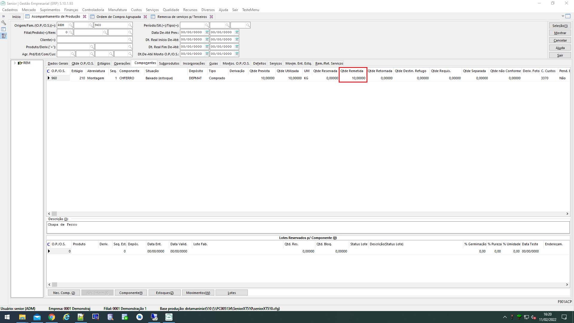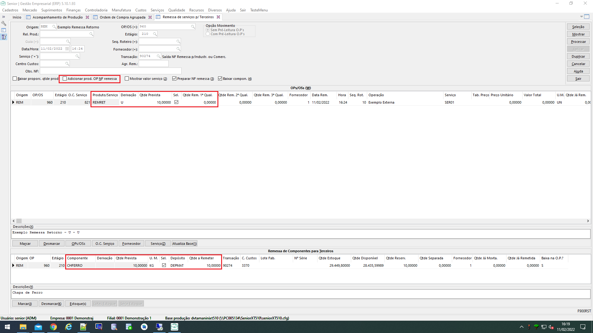 Quando forem enviadas 0 unidades do produto acabado, significará que estão sendo remetidos primeiramente "X" quantidades dos componentes e assim, será possível ter um rastreio de todas as remessas de componentes da OP em questão via tela F901ACP, aba 'Rem./Ret. Serviços', mesmo que as remessas sejam somente de componentes.