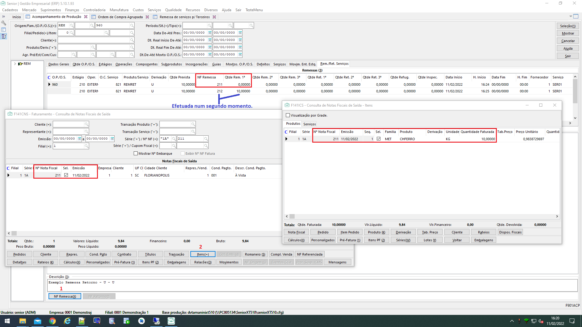 Ou seja, no cenário proposto o vínculo da nota de remessa com a OP não seria possível, porém é possível chegar nesta segunda nota de remessa através do retorno (quando há os vínculos efetuados).
