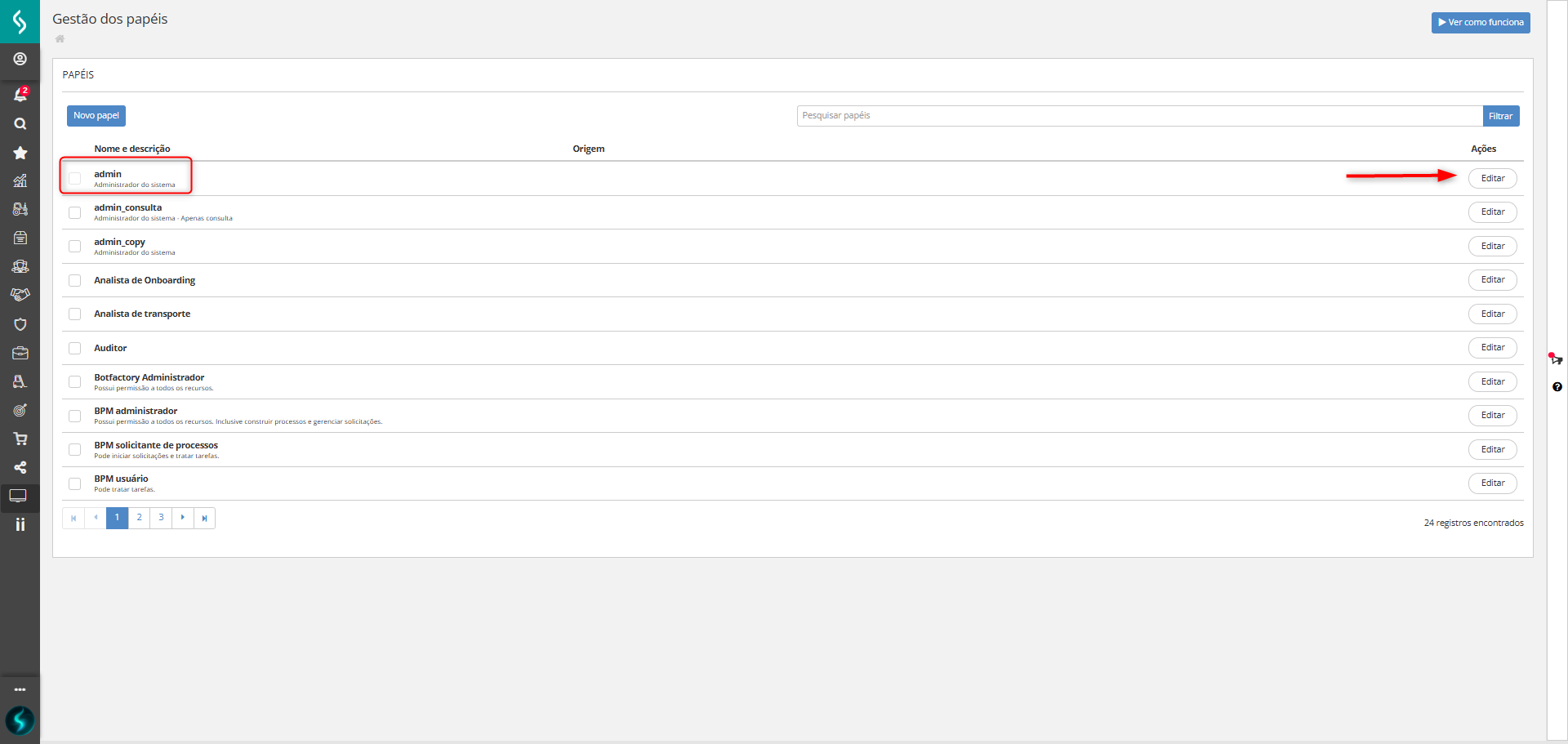 - Clique no botão Editar do papel que deseja incluir o recurso, conforme print abaixo: