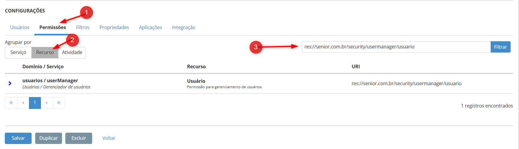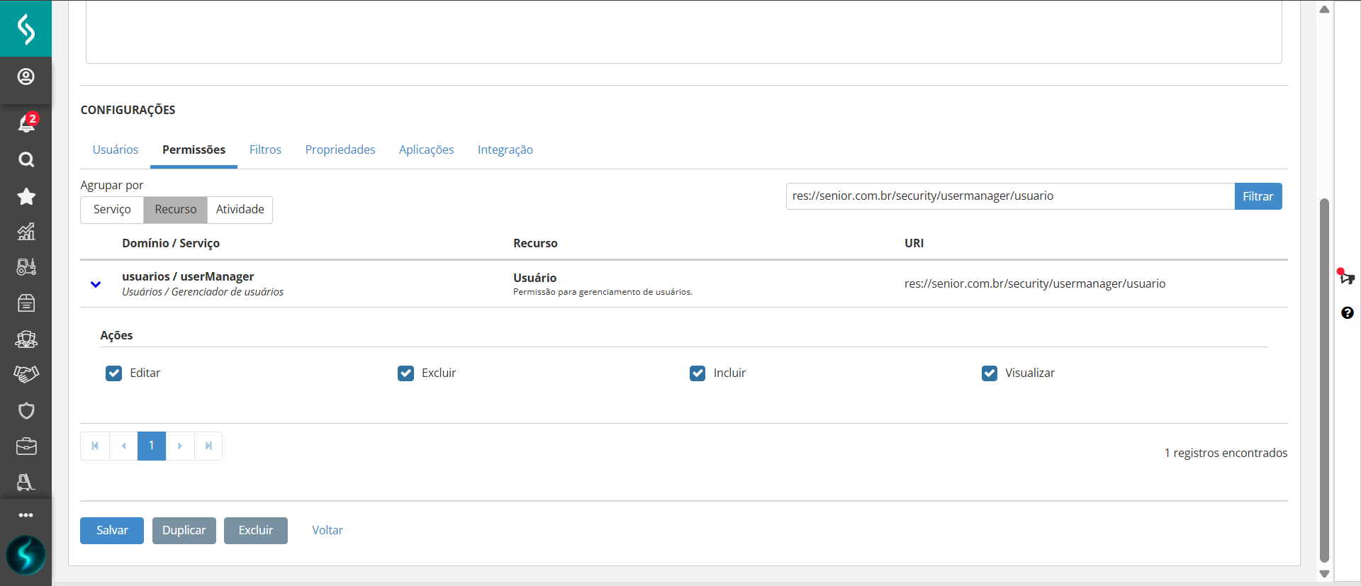 - Acesse a aba Permissões / Recurso e filtre pelo recurso que deseje vincular neste papel: