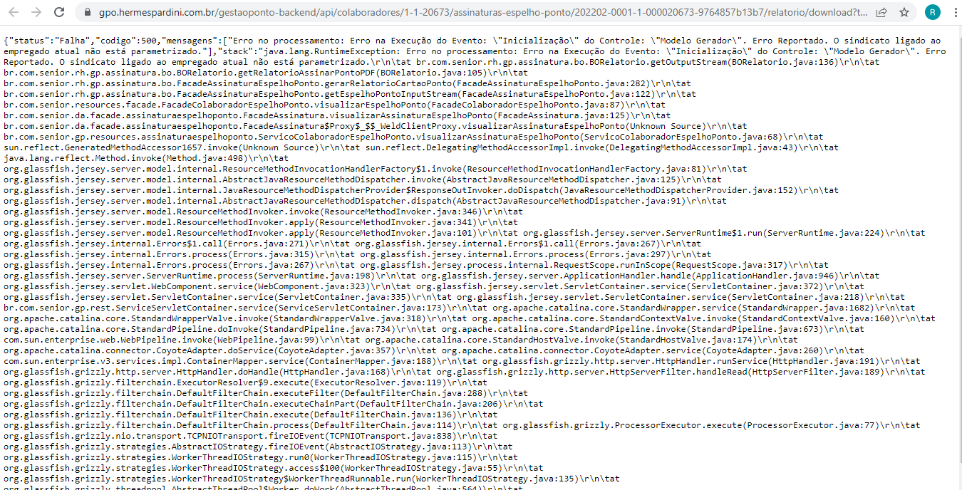 {"status":"Falha","codigo":500,"mensagens":["Erro no processamento: Erro na Execução do Evento: \"Inicialização\" do Controle: \"Modelo Gerador\". Erro Reportado. O sindicato ligado ao empregado atual não está parametrizado."],"stack":"java.lang.RuntimeException: Erro no processamento: Erro na Execução do Evento: \"Inicialização\" do Controle: \"Modelo Gerador\". Erro Reportado. O sindicato ligado ao empregado atual não está parametrizado.\r\n\tat br.com.senior.rh.gp.assinatura.bo.BORelatorio.getOutputStream(BORelatorio.java:136)\r\n\tat br.com.senior.rh.gp.assinatura.bo.BORelatorio.getRelatorioAssinarPontoPDF(BORelatorio.java:105)\r\n\tat br.com.senior.rh.gp.assinatura.bo.FacadeAssinaturaEspelhoPonto.gerarRelatorioCartaoPonto(FacadeAssinaturaEspelhoPonto.java:282)\r\n\tat br.com.senior.rh.gp.assinatura.bo.FacadeAssinaturaEspelhoPonto.getEspelhoPontoInputStream(FacadeAssinaturaEspelhoPonto.java:122)\r\n\tat br.com.senior.resources.facade.FacadeColaboradorEspelhoPonto.visualizarEspelhoPonto(FacadeColaboradorEspelhoPonto.java:87)\r\n\tat br.com.senior.da.facade.assinaturaespelhoponto.FacadeAssinatura.visualizarAssinaturaEspelhoPonto(FacadeAssinatura.java:125)\r\n\tat br.com.senior.da.facade.assinaturaespelhoponto.FacadeAssinatura$Proxy$_$$_WeldClientProxy.visualizarAssinaturaEspelhoPonto(Unknown Source)\r\n\tat br.com.senior.gp.resources.assinaturaespelhoponto.ServicoColaboradorEspelhoPonto.visualizarAssinaturaEspelhoPonto(ServicoColaboradorEspelhoPonto.java:68)\r\n\tat sun.reflect.NativeMethodAccessorImpl.invoke0(Native Method)\r\n\tat sun.reflect.NativeMethodAccessorImpl.invoke(NativeMethodAccessorImpl.java:62)\r\n\tat sun.reflect.DelegatingMethodAccessorImpl.invoke(DelegatingMethodAccessorImpl.java:43)\r\n\tat java.lang.reflect.Method.invoke(Method.java:498)\r\n\tat org.glassfish.jersey.server.model.internal.ResourceMethodInvocationHandlerFactory$1.invoke(ResourceMethodInvocationHandlerFactory.java:81)\r\n\tat org.glassfish.jersey.server.model.internal.AbstractJavaResourceMethodDispatcher.invoke(AbstractJavaResourceMethodDispatcher.java:125)\r\n\tat org.glassfish.jersey.server.model.internal.JavaResourceMethodDispatcherProvider$ResponseOutInvoker.doDispatch(JavaResourceMethodDispatcherProvider.java:152)\r\n\tat org.glassfish.jersey.server.model.internal.AbstractJavaResourceMethodDispatcher.dispatch(AbstractJavaResourceMethodDispatcher.java:91)\r\n\tat org.glassfish.jersey.server.model.ResourceMethodInvoker.invoke(ResourceMethodInvoker.java:346)\r\n\tat org.glassfish.jersey.server.model.ResourceMethodInvoker.apply(ResourceMethodInvoker.java:341)\r\n\tat org.glassfish.jersey.server.model.ResourceMethodInvoker.apply(ResourceMethodInvoker.java:101)\r\n\tat org.glassfish.jersey.server.ServerRuntime$1.run(ServerRuntime.java:224)\r\n\tat org.glassfish.jersey.internal.Errors$1.call(Errors.java:271)\r\n\tat org.glassfish.jersey.internal.Errors$1.call(Errors.java:267)\r\n\tat org.glassfish.jersey.internal.Errors.process(Errors.java:315)\r\n\tat org.glassfish.jersey.internal.Errors.process(Errors.java:297)\r\n\tat org.glassfish.jersey.internal.Errors.process(Errors.java:267)\r\n\tat org.glassfish.jersey.process.internal.RequestScope.runInScope(RequestScope.java:317)\r\n\tat org.glassfish.jersey.server.ServerRuntime.process(ServerRuntime.java:198)\r\n\tat org.glassfish.jersey.server.ApplicationHandler.handle(ApplicationHandler.java:946)\r\n\tat org.glassfish.jersey.servlet.WebComponent.service(WebComponent.java:323)\r\n\tat org.glassfish.jersey.servlet.ServletContainer.service(ServletContainer.java:372)\r\n\tat org.glassfish.jersey.servlet.ServletContainer.service(ServletContainer.java:335)\r\n\tat org.glassfish.jersey.servlet.ServletContainer.service(ServletContainer.java:218)\r\n\tat br.com.senior.gp.rest.ServiceServletContainer.service(ServiceServletContainer.java:173)\r\n\tat org.apache.catalina.core.StandardWrapper.service(StandardWrapper.java:1682)\r\n\tat org.apache.catalina.core.StandardWrapperValve.invoke(StandardWrapperValve.java:318)\r\n\tat org.apache.catalina.core.StandardContextValve.invoke(StandardContextValve.java:160)\r\n\tat org.apache.catalina.core.StandardPipeline.doInvoke(StandardPipeline.java:734)\r\n\tat org.apache.catalina.core.StandardPipeline.invoke(StandardPipeline.java:673)\r\n\tat com.sun.enterprise.web.WebPipeline.invoke(WebPipeline.java:99)\r\n\tat org.apache.catalina.core.StandardHostValve.invoke(StandardHostValve.java:174)\r\n\tat org.apache.catalina.connector.CoyoteAdapter.doService(CoyoteAdapter.java:357)\r\n\tat org.apache.catalina.connector.CoyoteAdapter.service(CoyoteAdapter.java:260)\r\n\tat com.sun.enterprise.v3.services.impl.ContainerMapper.service(ContainerMapper.java:188)\r\n\tat org.glassfish.grizzly.http.server.HttpHandler.runService(HttpHandler.java:191)\r\n\tat org.glassfish.grizzly.http.server.HttpHandler.doHandle(HttpHandler.java:168)\r\n\tat org.glassfish.grizzly.http.server.HttpServerFilter.handleRead(HttpServerFilter.java:189)\r\n\tat org.glassfish.grizzly.filterchain.ExecutorResolver$9.execute(ExecutorResolver.java:119)\r\n\tat org.glassfish.grizzly.filterchain.DefaultFilterChain.executeFilter(DefaultFilterChain.java:288)\r\n\tat org.glassfish.grizzly.filterchain.DefaultFilterChain.executeChainPart(DefaultFilterChain.java:206)\r\n\tat org.glassfish.grizzly.filterchain.DefaultFilterChain.execute(DefaultFilterChain.java:136)\r\n\tat org.glassfish.grizzly.filterchain.DefaultFilterChain.process(DefaultFilterChain.java:114)\r\n\tat org.glassfish.grizzly.ProcessorExecutor.execute(ProcessorExecutor.java:77)\r\n\tat org.glassfish.grizzly.nio.transport.TCPNIOTransport.fireIOEvent(TCPNIOTransport.java:838)\r\n\tat org.glassfish.grizzly.strategies.AbstractIOStrategy.fireIOEvent(AbstractIOStrategy.java:113)\r\n\tat org.glassfish.grizzly.strategies.WorkerThreadIOStrategy.run0(WorkerThreadIOStrategy.java:115)\r\n\tat org.glassfish.grizzly.strategies.WorkerThreadIOStrategy.access$100(WorkerThreadIOStrategy.java:55)\r\n\tat org.glassfish.grizzly.stra