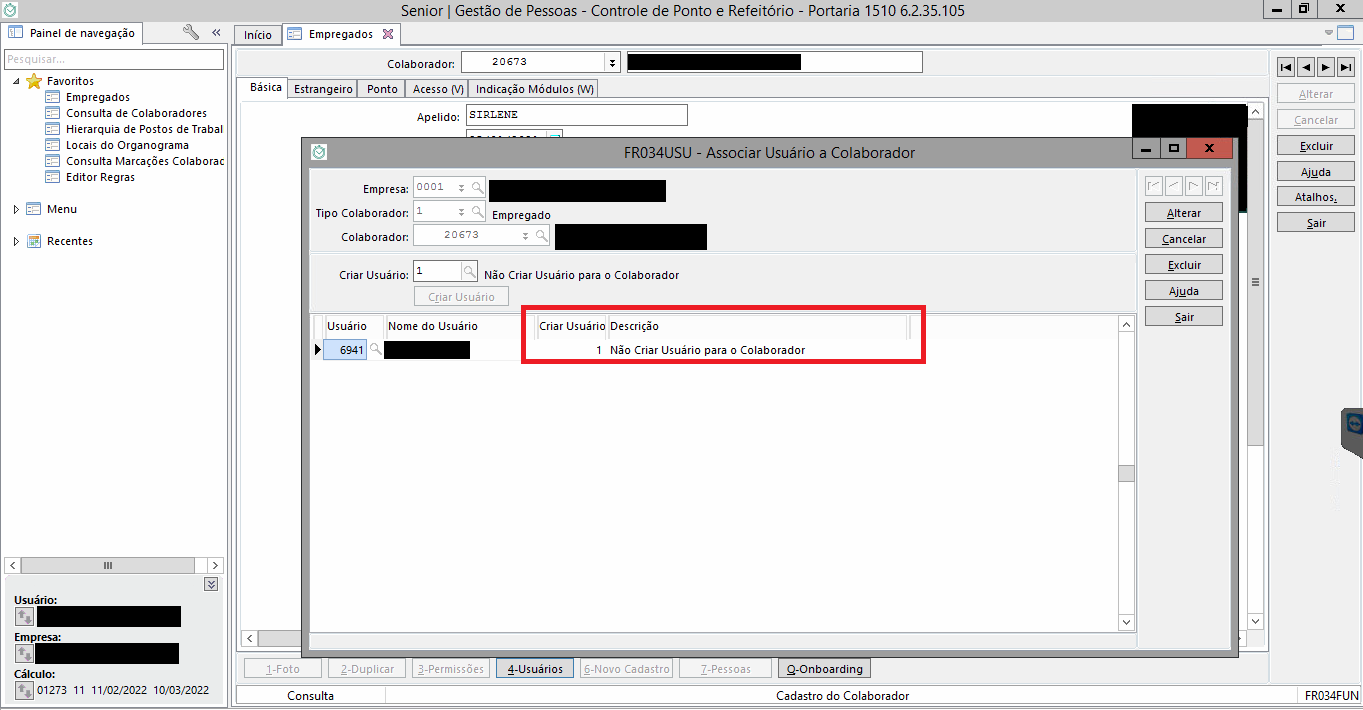 No Módulo Controle de Ponto e Refeitório > Menu > Colaboradores > Ficha Cadastral > Empregados > Botão 4 - Usuários > Coluna "Criar Usuário" estava como 1 - Não Criar Usuário para o Colaborador e deveria estar como 2 - Criar com Abrangência Individual (Empresa/Tipo Colaborador/Cadastro) pois ocorre alguns problemas com abrangência no Gestão do Ponto se estiver coma opção 1.