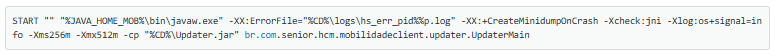 START "" "%JAVA_HOME_MOB%\bin\javaw.exe" -XX:ErrorFile="%CD%\logs\hs_err_pid%%p.log" -XX:+CreateMinidumpOnCrash -Xcheck:jni -Xlog:os+signal=info -Xms256m -Xmx512m -cp "%CD%\Updater.jar" br.com.senior.hcm.mobilidadeclient.updater.UpdaterMain
