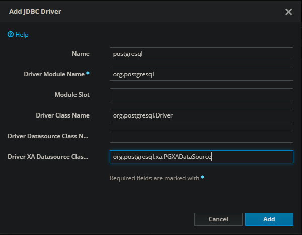 Driver XA Datasource Class Name: org.postgresql.xa.PGXADataSource.6. Reinicie o domínio do Wildfly.