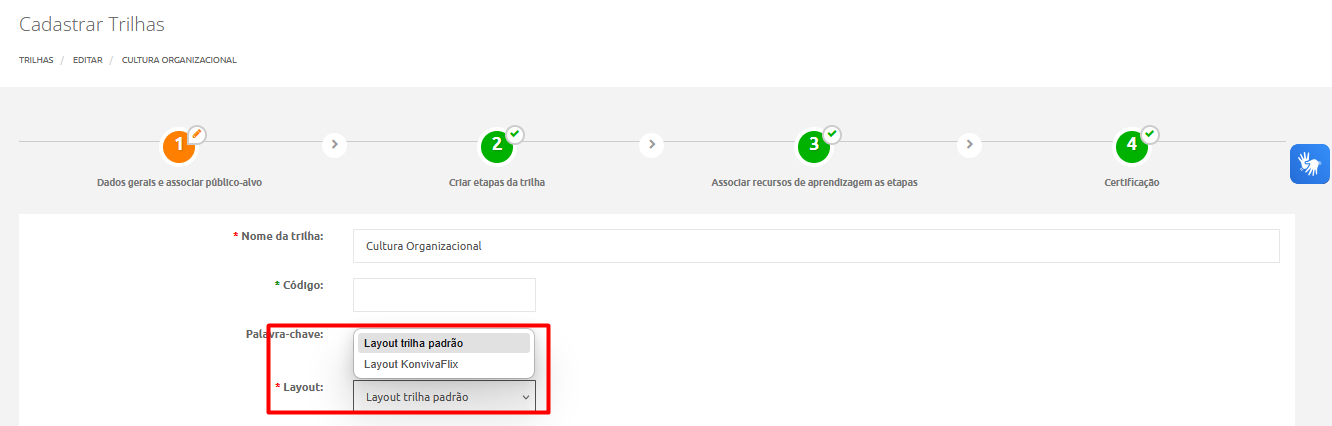 Após confirmar a ativação, ao acessar o menu Aprendizagem > Trilhas e editar uma trilha existente ou criar uma nova, será exibido um novo campo chamado “Layout”, conforme ilustrado na imagem abaixo: