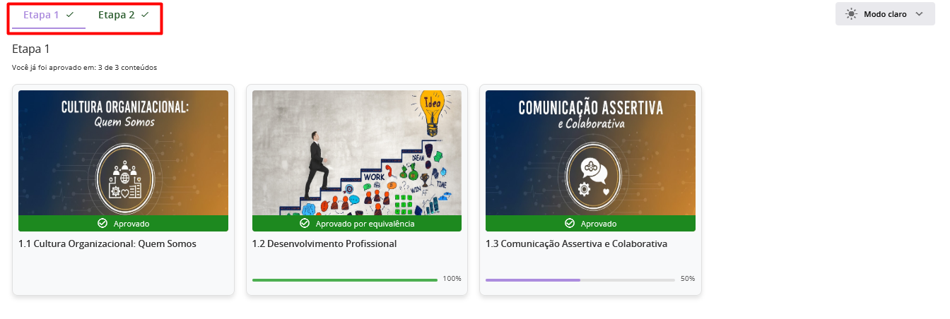 Cada etapa da trilha passa a ser exibida como uma aba individual, mantendo a organização clara e sequencial.