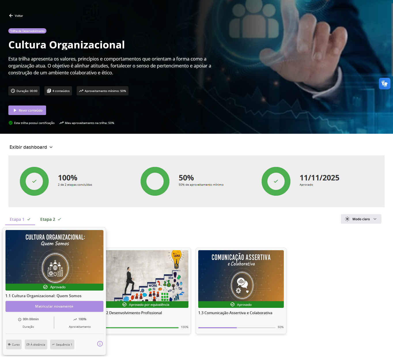- O texto de descrição da trilha será posicionado sobre o banner, recomendamos validar as cores do banner para que não dificulte a visualização da descrição da trilha.