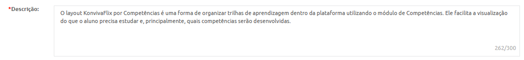 Descrição: Ao selecionar a opção “Layout Konvivaflix com carrosséis por competência”, o campo “Descrição” se torna obrigatório. Nele, você deve inserir um texto descritivo sobre a trilha — essa informação é essencial para garantir uma boa apresentação visual do layout.