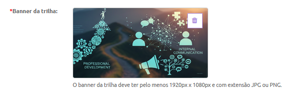 Banner da Trilha: Este campo também passa a ser obrigatório. O banner deve ter no mínimo 1920 px x 1080 px, nos formatos JPG ou PNG. Assim como a descrição, o banner é fundamental para a boa estética do layout.