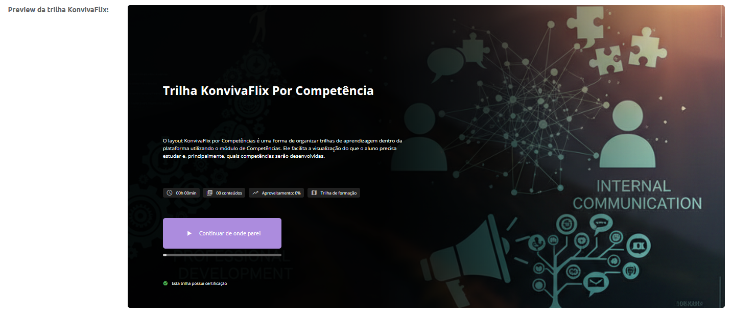 Preview da trilha Konvivaflix: Após inserir a descrição e o banner, será possível visualizar uma prévia de como a trilha aparecerá para o aluno.