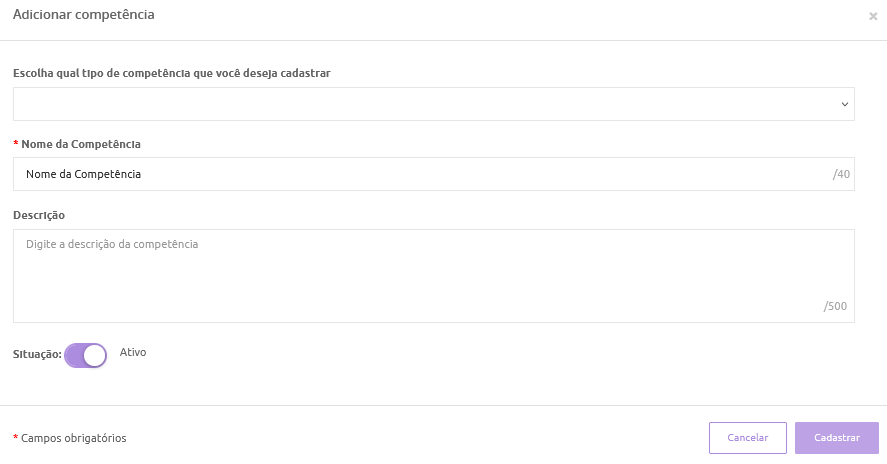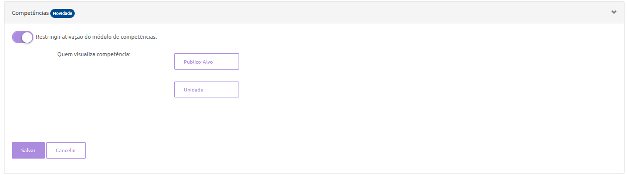 Nesta área você poderá restringir ativação do módulo de competências para um público alvo e/ou unidade
