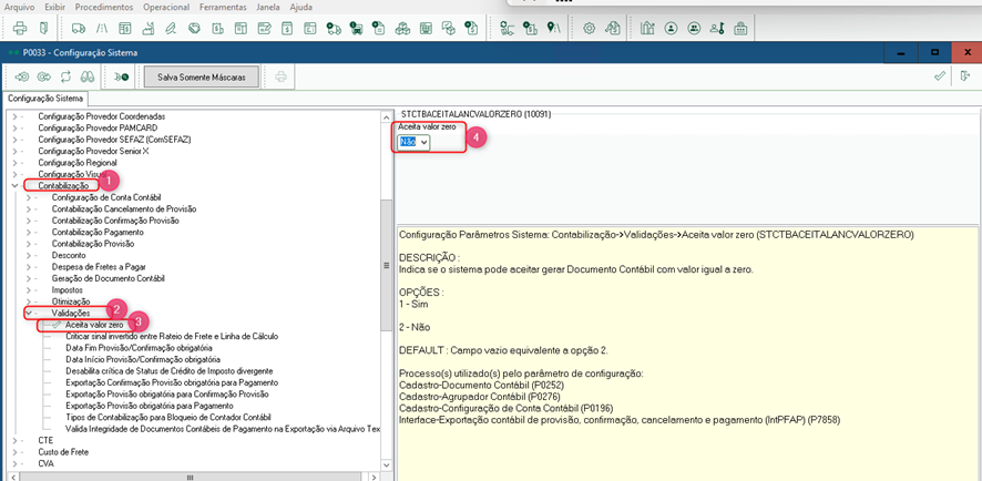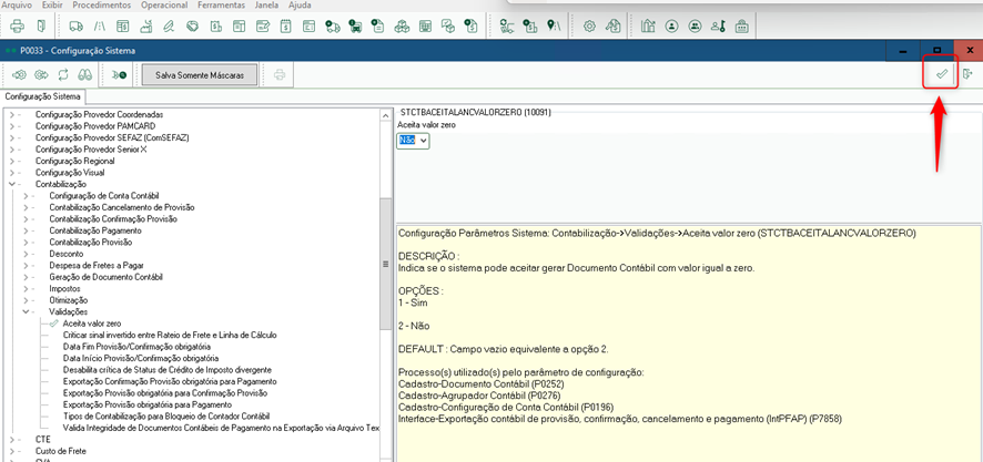 2. Expanda: Contabilização/ Validações/ Aceitar valor zero