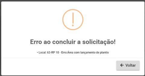 No SimpleFarm, ao tentar excluir um talhão na aba Local do lançamento da ordem de serviço de plantio, é apresentada a seguinte mensagem: Erro ao concluir a solicitação! Erro: Área com lançamento de plantio.