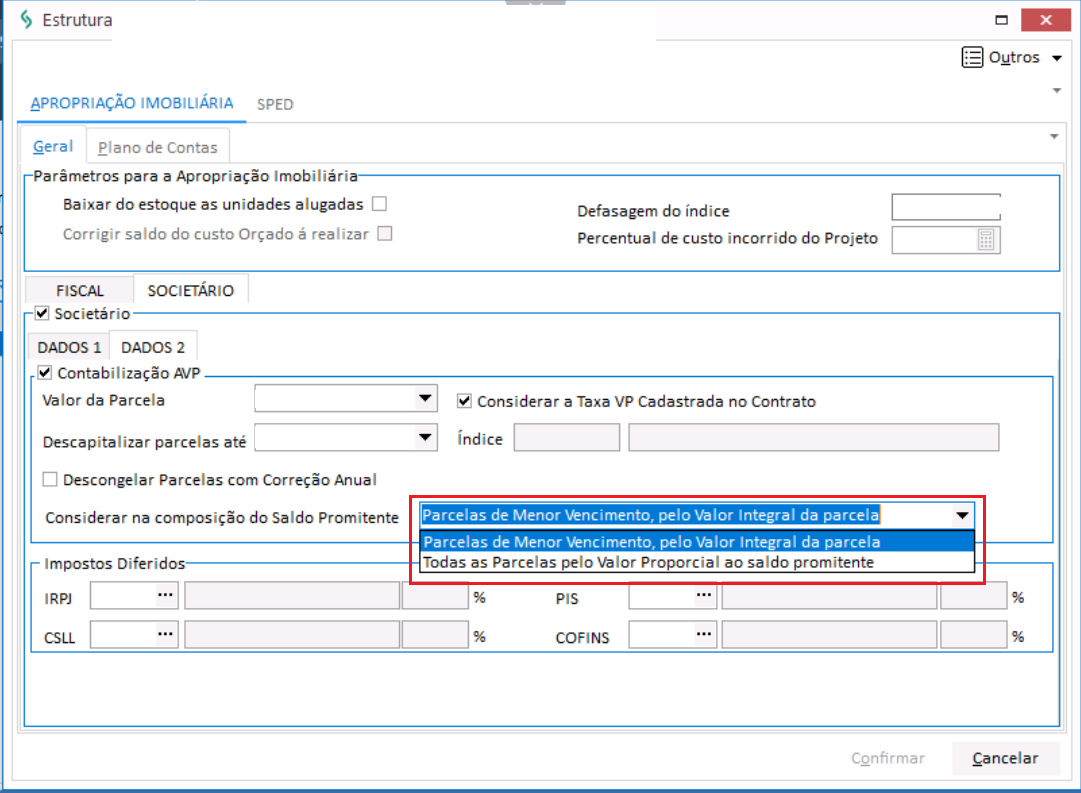 Com o parâmetro 'Considerar na composição do Saldo Promitente', será possível selecionar a metodologia utilizada no cálculo do saldo promitente, permitindo ajustar a forma como o sistema apura os valores de curto e longo prazo.