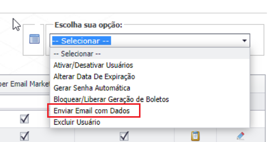 3. Selecione novamente o usuário e no quadro 'Escolha uma opção', selecione a opção 'Enviar Email com Dados', para enviar os novos dados de acesso ao cliente: