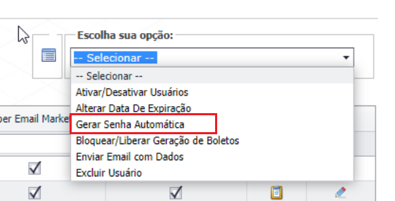 2. Selecione o usuário desejado e na parte superior da tela, no quadro 'Escolha uma opção', selecione a opção 'Gerar Senha Automática':